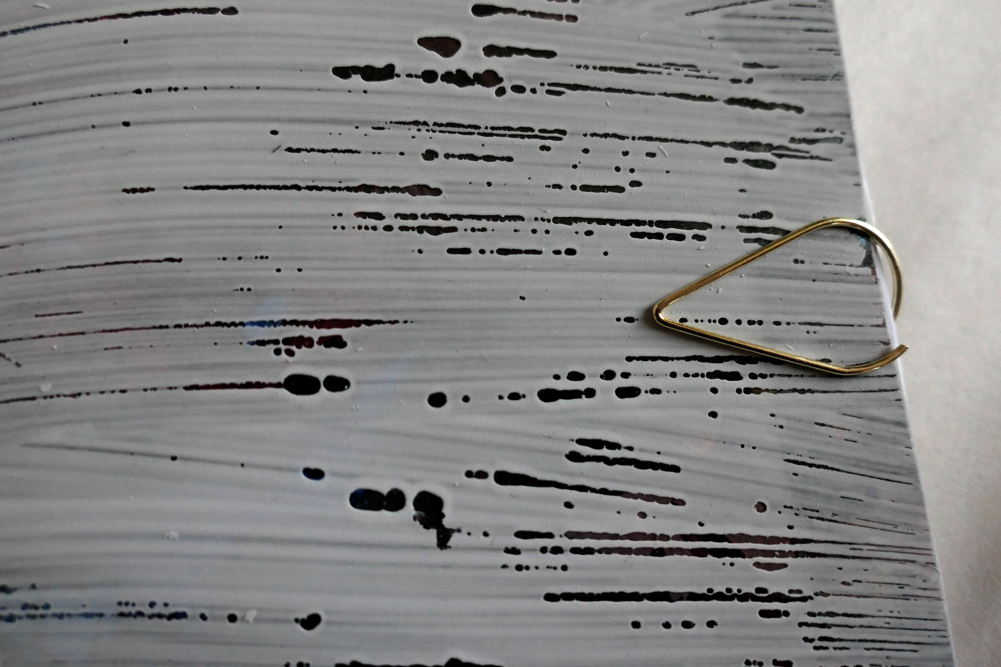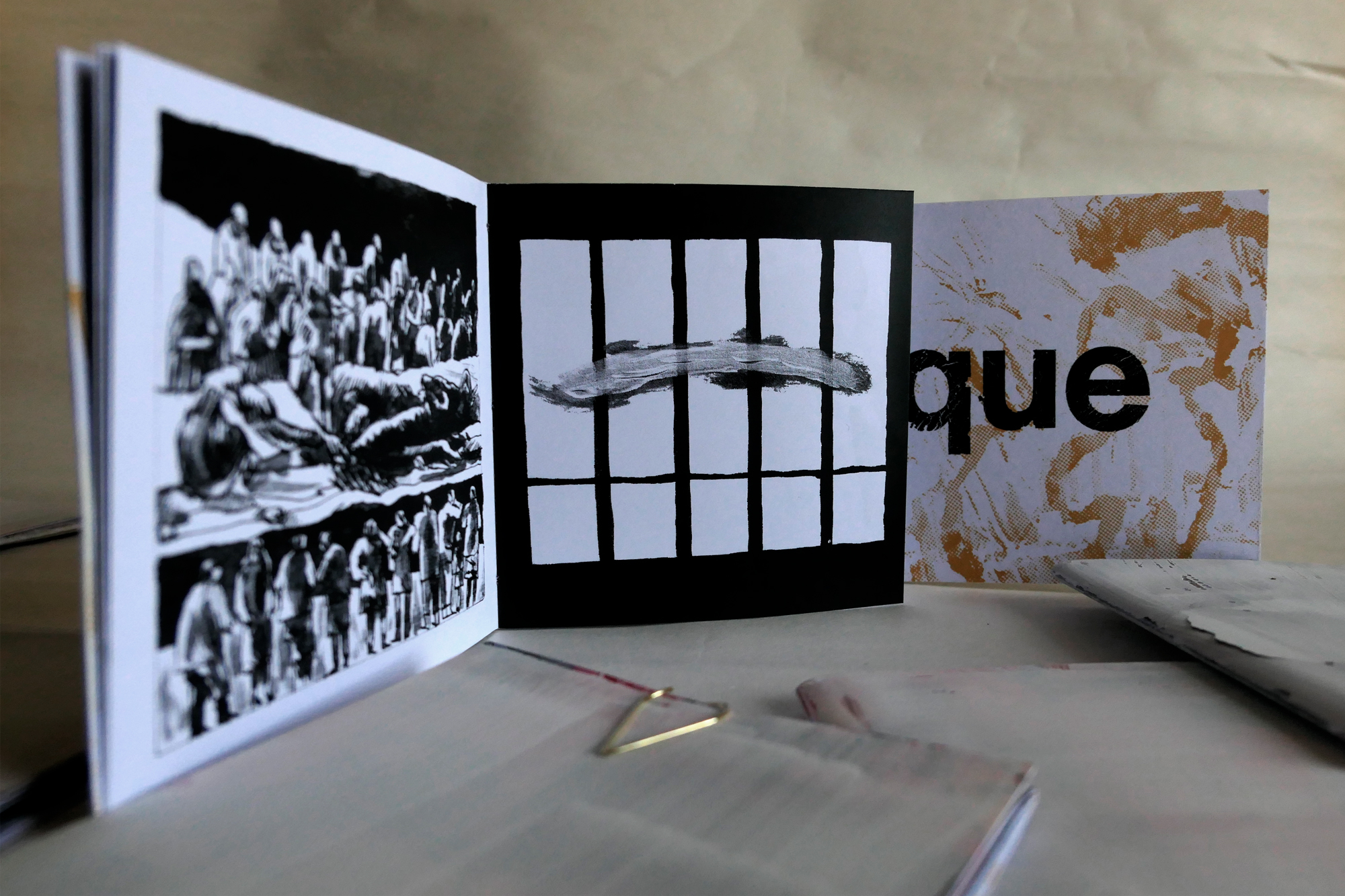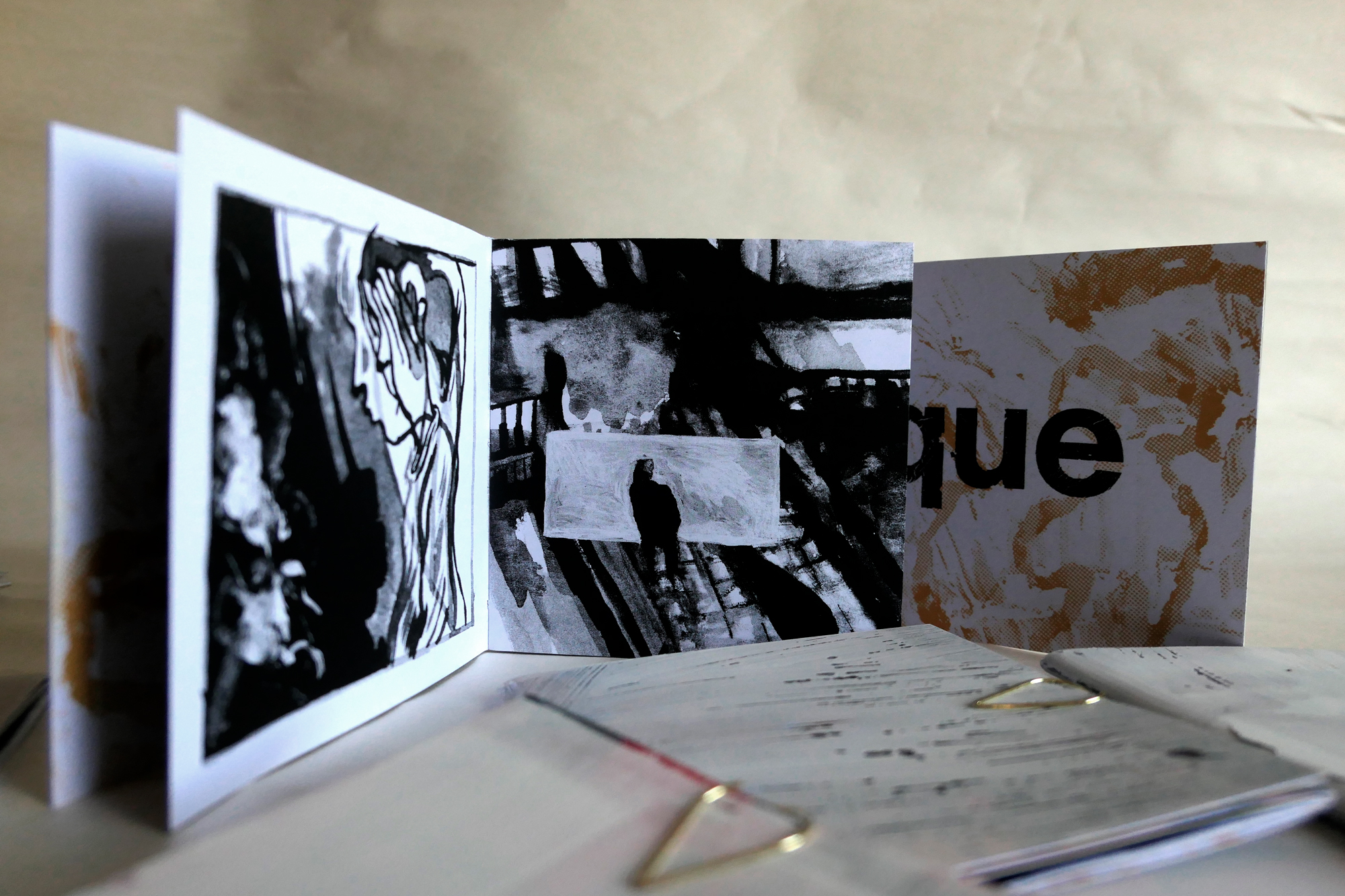 Le trombone sert à la fois à garder le zine fermé (le plastique chercher à se déployer) et comme outil de dessin/grattoir.